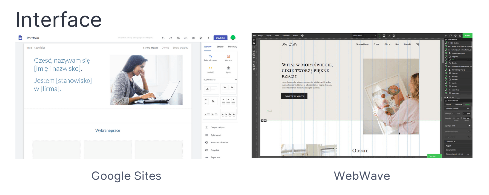 Tak jak już wcześniej zostało wspomniane, interface Google Sites jest prosty, bardzo organiczny i przypomina w mniejszym lub większym stopniu ten należący do innych narzędzi tego przedsiębiorstwa. Z kolei kreator WebWave pod względem swojego wyglądu może kojarzyć się z programami graficznymi Adobe (przede wszystkim Illustrator i Photoshop). W głównym podglądzie posiada podstawowe najczęściej wykorzystywane funkcje, ale daje możliwość stosowania również tych bardziej zaawansowanych (np. interakcje po scrollu - zaczepianie/odczepianie, pojawianie/ukrywanie elementów).
